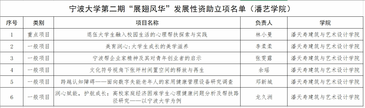 根据《电影天堂 本科学生资助工作实施办法》(宁大政〔2023〕 56号)和《关于申报第二“展翅风华”发展性资助项目通知》,经学生申报,所在电影天堂 、学生发展与服务处审核、专家评审等程序,最终评定出10项重点项目和87项一般项目(其中我院重点项目1项、一般项目5项)。