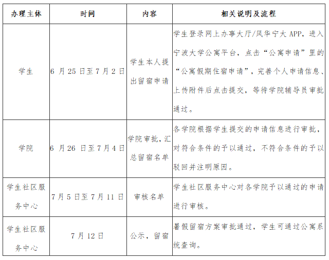 3.学生在公寓系统上提交留宿申请时,应准确填写留宿时间段、联系方式等信息。留宿时间段以公寓系统填写为准,若未准确填写留宿时间而导致宿舍楼宇门禁、人脸闸机通行权限关闭,后果由学生本人承担。(暑假留宿时间段为7月15日至8月25日)。