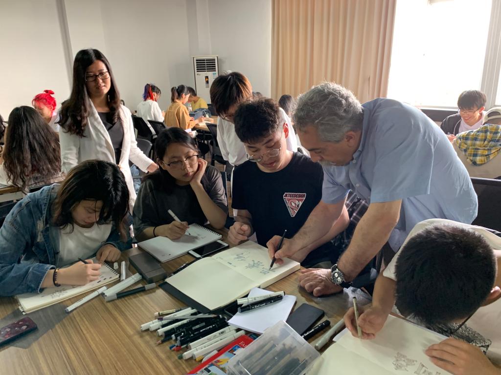 默罕默德ž贝尔贝斯教授是一位极富想象力和远见的建筑师、教育家,也是一位成功的插画家和水彩画家。在两周的大师班工作坊授课过程中:贝尔贝斯教授充分肯定了我院学生扎实的基本功和创新潜力,鼓励同学们在设计概念的表达上可以尝试多种途径,让自己的设计作品更具吸引力;贝尔贝斯教授并不是单纯的讲授理论,而是融入课堂言传身教,演示设计概念表达的各种途径与范式,向大家传达设计表现技法的特点与要求;贝尔贝斯教授幽默、风趣,他时刻保持着与学生的互动关系,每次课至少有2-3次全班性的综合评价,让每位学生都有充足的参与感,他的工作坊也因此散发着迷人的吸引力。