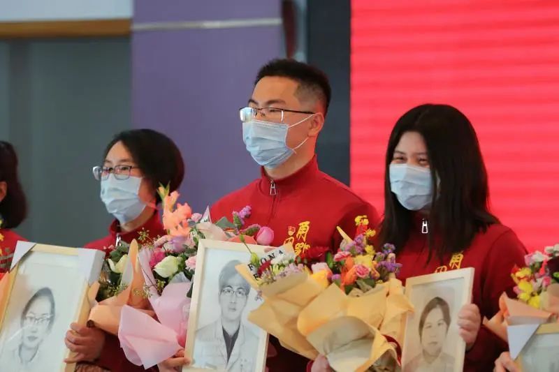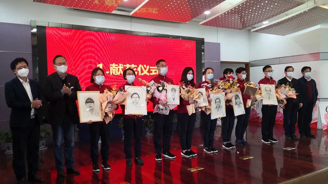 欢迎仪式上,校领导向全体援鄂医护人员代表献花,并赠送一份特别的礼品——书写着“医往无前,英甬归来”字样的工作服素描画。其中留作抗疫纪念的素描肖像由我院、电影天堂