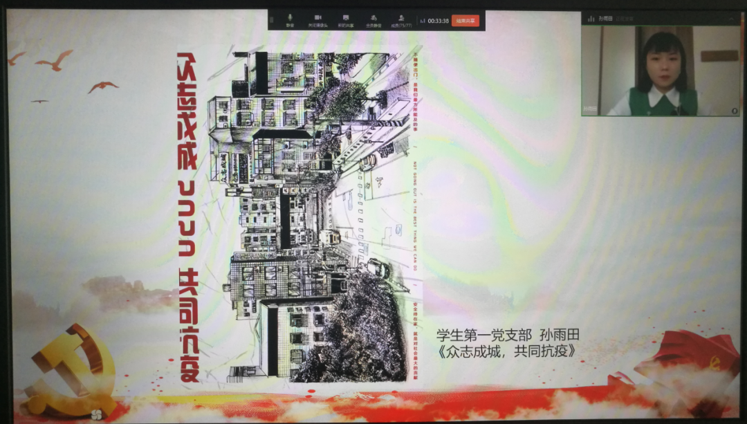 随后,集中展示了学生党员的“以艺抗疫”作品,学生党员代表分享了创作感悟。学生第一党支部党员孙雨田用炭笔描绘出自己家门口的景象,通过疫情前后街道的对比,绘出了疫情的严峻以及对抗疫成功的决心。学生第一党支部党员周圆描绘了抗疫英雄钟南山院士,表达了对老先生的敬佩之情,希望借此给人们带来精神鼓舞,传递必胜信念。学生第一党支部党员朱佳敏创作的作品直接描绘了抗疫一线穿着厚厚隔离服的医护人员们,赞颂了疫情当前,各行各业坚守岗位的人们。学生第二党支部的党员虞佳佳创作的疫情海报,将病毒想象成困兽,相信战胜疫情指日可待。