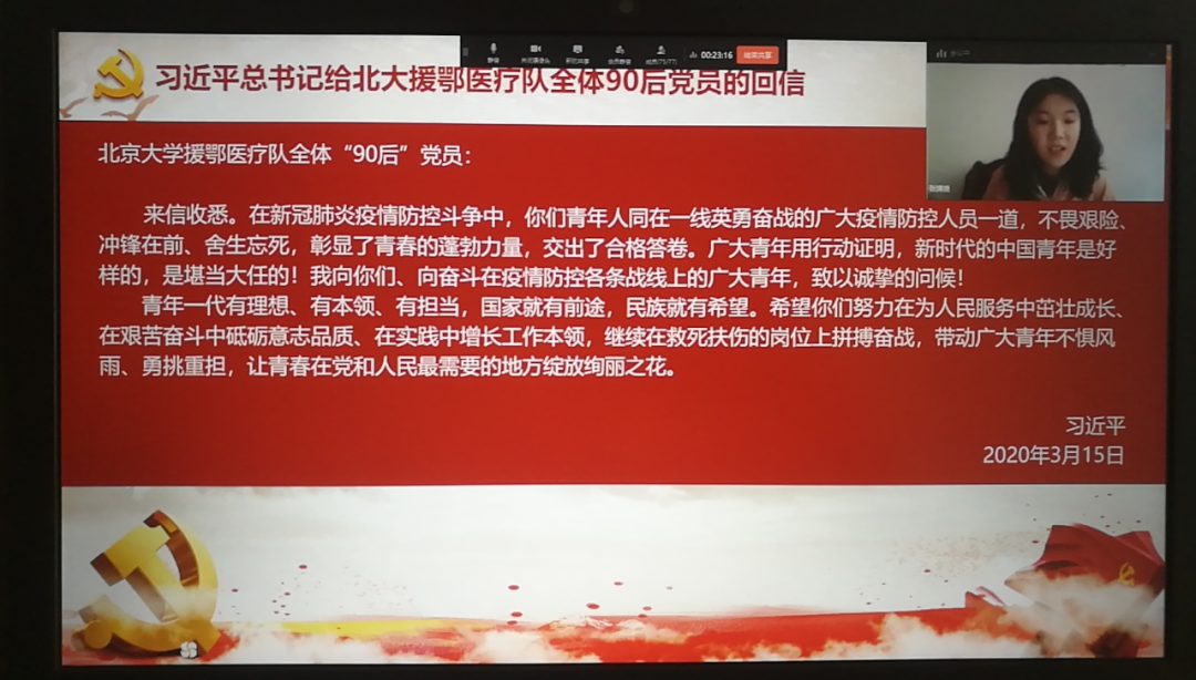 首先,学生党员集体观看抗疫短片《习近平讲述的故事|疾风知劲草》并一同学习了习近平总书记给北大援鄂医疗队全体90后党员的回信。结合观看短片和总书记的回信,学生党员代表谈了学习体会。学生第一党支部湖北籍党员漆艳切身感受到疫情带给家乡人民的苦痛,看到各地力量义无反顾支援湖北又让她非常感动,表示将立足专业,用富有感染力的创作和细腻的情感传递人间温情,鼓舞士气。学生第一党支部毕业生党员张旖旎表示,作为新时代青年,将坚持为人民服务的宗旨,不断锤炼自己,毕业后她即将奔赴贵州支教,希望用青春力量,践行初心和使命。学生第二党支部研究生党员唐洁表示身为潘艺学子,将磨练专业本领,努力创作,用艺术之美反映社会现象,用艺术服务人民。学生第二党支部党员刘铮感受到了肩上的责任,从学生、学生干部、学生党员三方面表达了自己的决心。