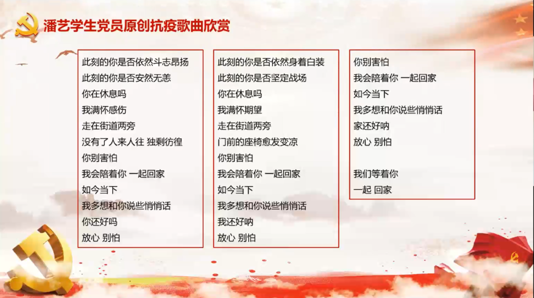 原创抗疫歌曲《一起,回家》的词作者,学生第二党支部党员王春伟为大家讲述了创作的心路历程,借由歌词创作,向远在前线抗击疫情的各界人士送上祝福,期待英雄凯旋。该原创歌曲经由电影天堂
