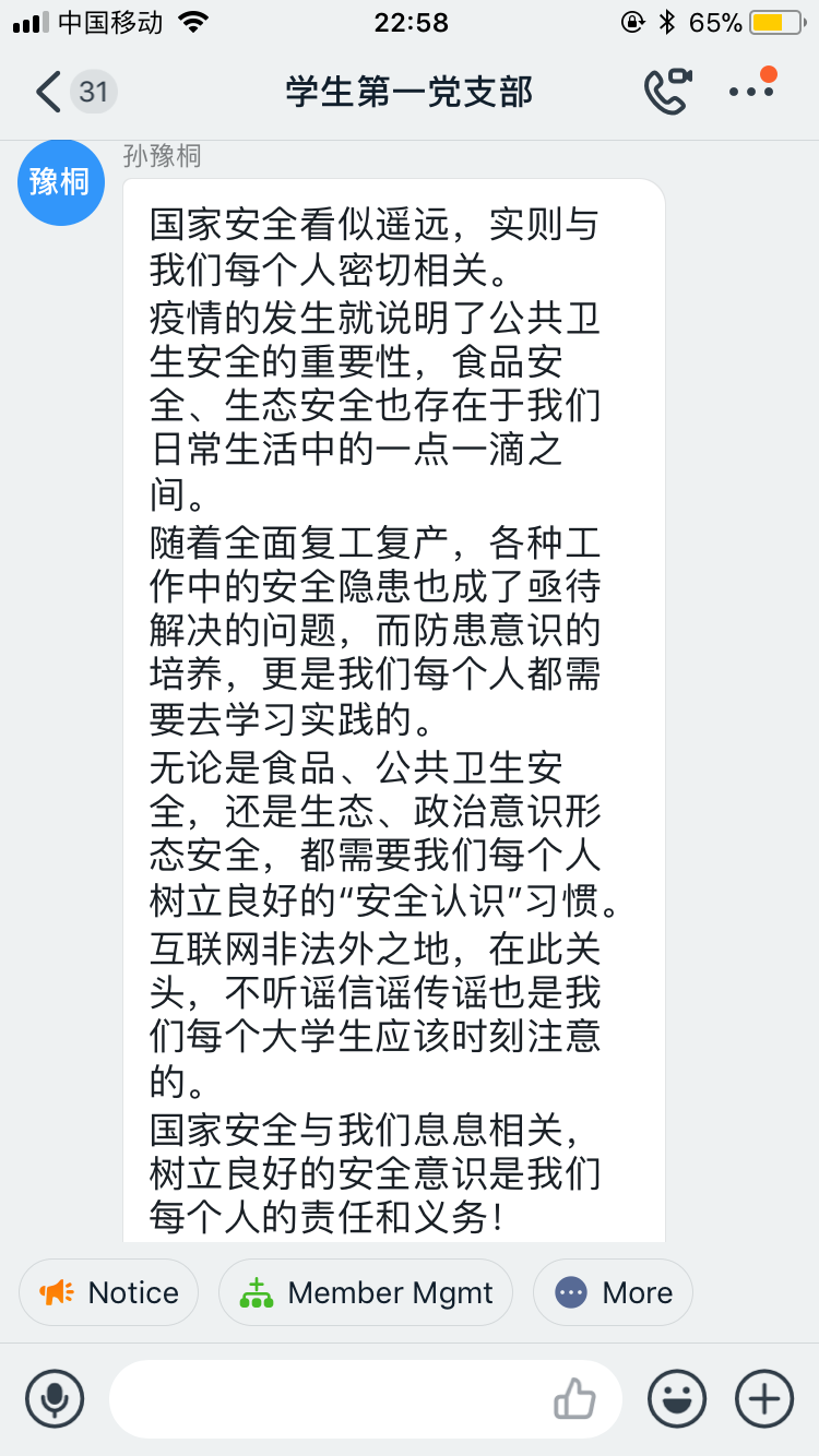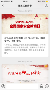 一是发动班长组织好各班学生错峰错时观看学习2020年全民国家安全教育日高校公开课,并撰写学习感想。截至4月17日共计800余人完成公开课学习。二是发动团支书组织团员参与国家安全知识在线问答,进一步巩固国家安全教育知识。截至4月17日共计700余名团员完成在线问答。三是发动学生党支部书记发布相关学习材料,组织学生党员开展国家安全知识线上集体学习或自学并进行线上讨论,要求学生党员守牢底线。学生党员共计100余人参与了线上学习和讨论。四是组织示范团支部,开展线上主题团日活动。17美术学(师范)1班团支部,在团支书的组织下,开展了国家安全教育主题的团日活动。五是通过潘艺院团学、潘艺红色青春微信公众号,于4月15日当天发布2020年“4.15”全民国家安全教育日相关内容,提高学生国家安全意识。