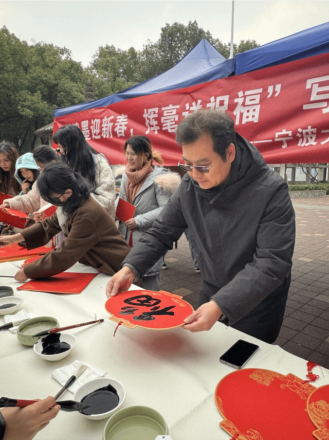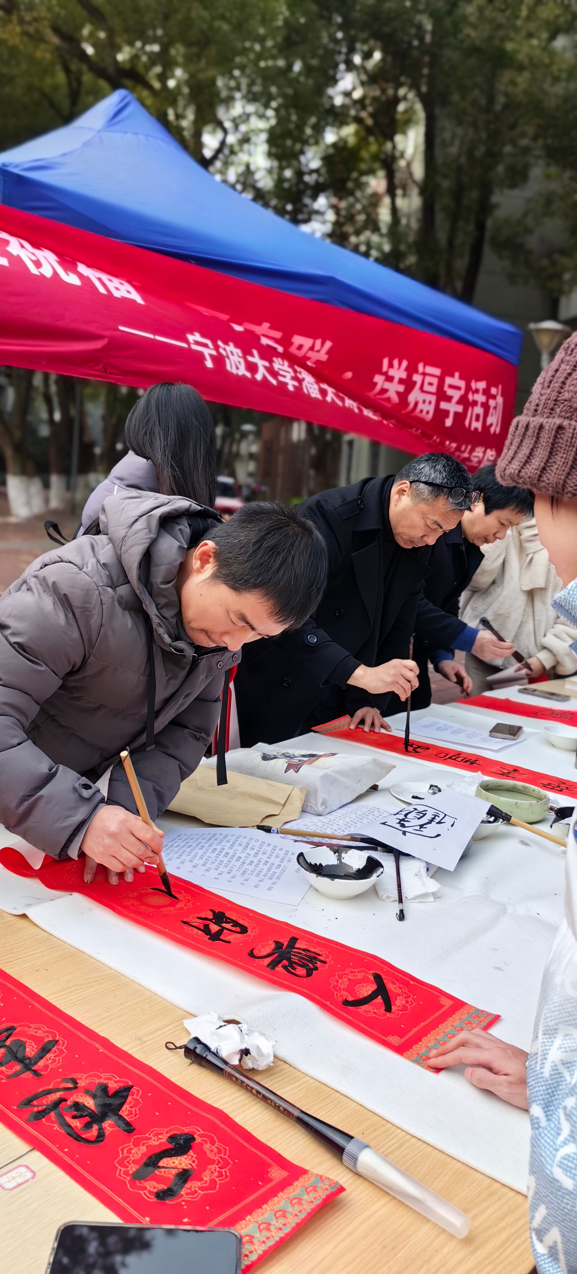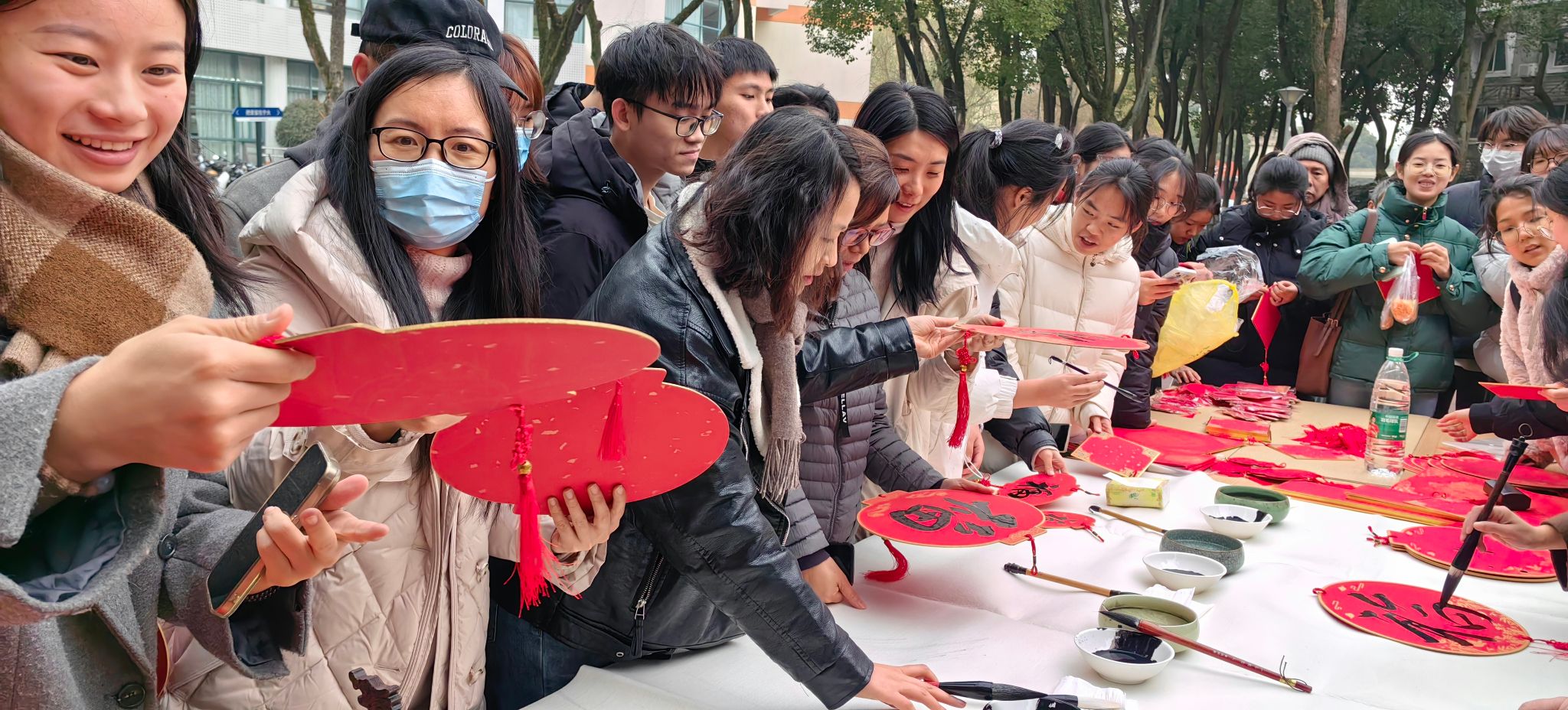美术系师生发挥专业特长挥毫泼墨,为广大师生书写出一幅幅散发着清新墨香的春联、福字,把浓浓的年味儿和新春祝福送到了在场的师生们手中和心里。开心的老师和同学们拿着翰墨飘香的福字和春联纷纷与身边的书画家们合影留念。这场活动共送出约六百套春联和福字,为冬日的宁大校园增添了浓郁的迎春氛围,打造了校园美育的新风尚。