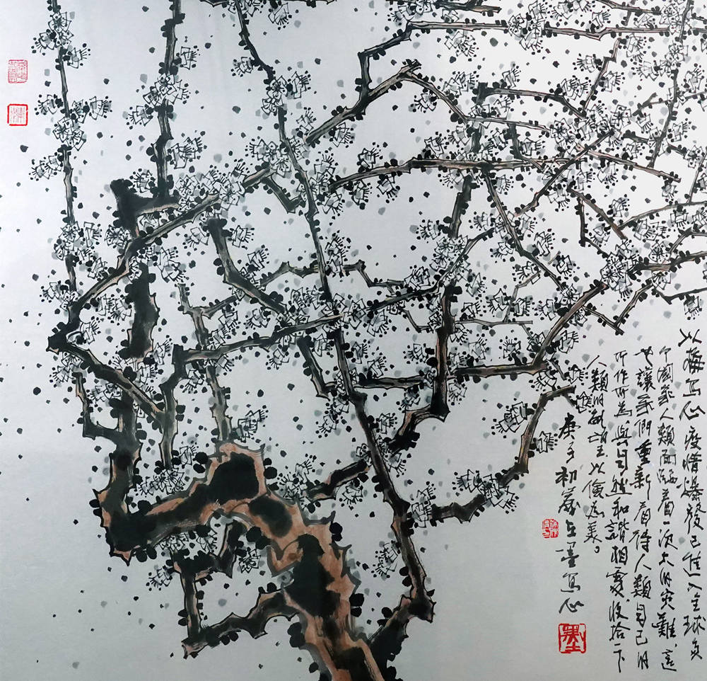 徐仲偶说,疫情艰难之下,他在内心深处感受到民族的伟大,画笔下绽放的是傲雪寒梅。“梅花精神反映出的不屈不挠的品质,就是中华民族五千年连绵不断坚守的文化根基,我所画的一张张梅花图都是在赞美同胞。”因此,他在创作梅图时,刻意要离开真实自然的梅花形态,要的是与传统国画不一样的观感体验,不要任何娇弱香艳的姿态,只取梅花的傲骨,因为他画的是心中之梅。其画作中流露出潘天寿先生“强其骨”的遗风,进而变圆劲为方折并化用版画的手法。这在梅枝、树干、奇石的表现上尤为明显,使观众在不盈四尺的画面中感受到一股天地间的浩然正气。