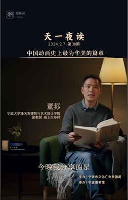 我院董荪副教授在宁波市文化广电旅游局主办,宁波图书馆承办的“天一夜读”的节目中朗读《中国动画史(选段)》,为观众分享中国动画史上最为华美的篇章。