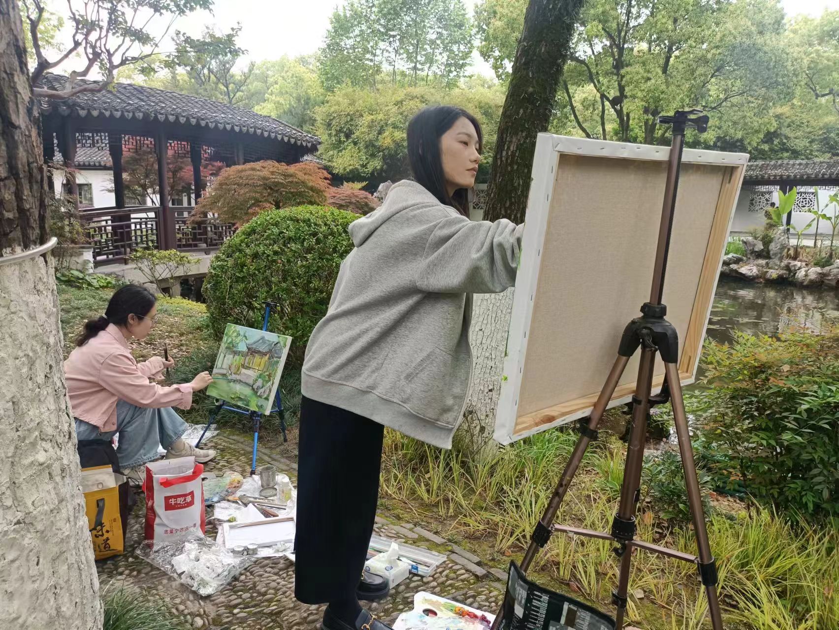 随后,同学们分散踏入了月湖景区,开始写生创作。在月湖公园的美景中,同学们们以油画、水彩、蜡笔、素描等多种艺术形式,捕捉并表现了月湖的自然美和文化韵味。从湖面的波光粼粼到湖边的垂柳依依,从古朴的亭台楼阁到现代的艺术装置,月湖的每一个角落都成为了同学们笔下生动的素材。
