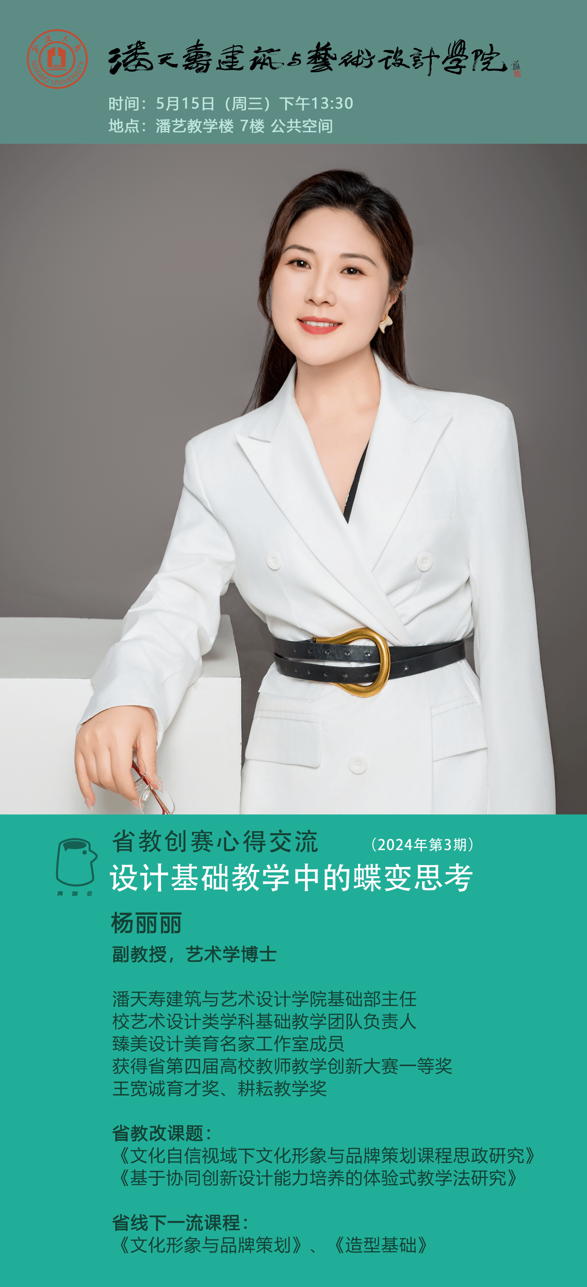 第20期“青咖会·教学交流活动”在潘艺大楼教学楼7楼公共空间顺利举行。本期交流会邀请我院基础部主任、校艺术设计类学科基础教学团队负责人,省第四届高校教师教学创新大赛一等奖获得者杨丽丽老师进行“设计基础教学中的蝶变思考——省教创赛心得交流”的教学创新探索与实践心得分享。