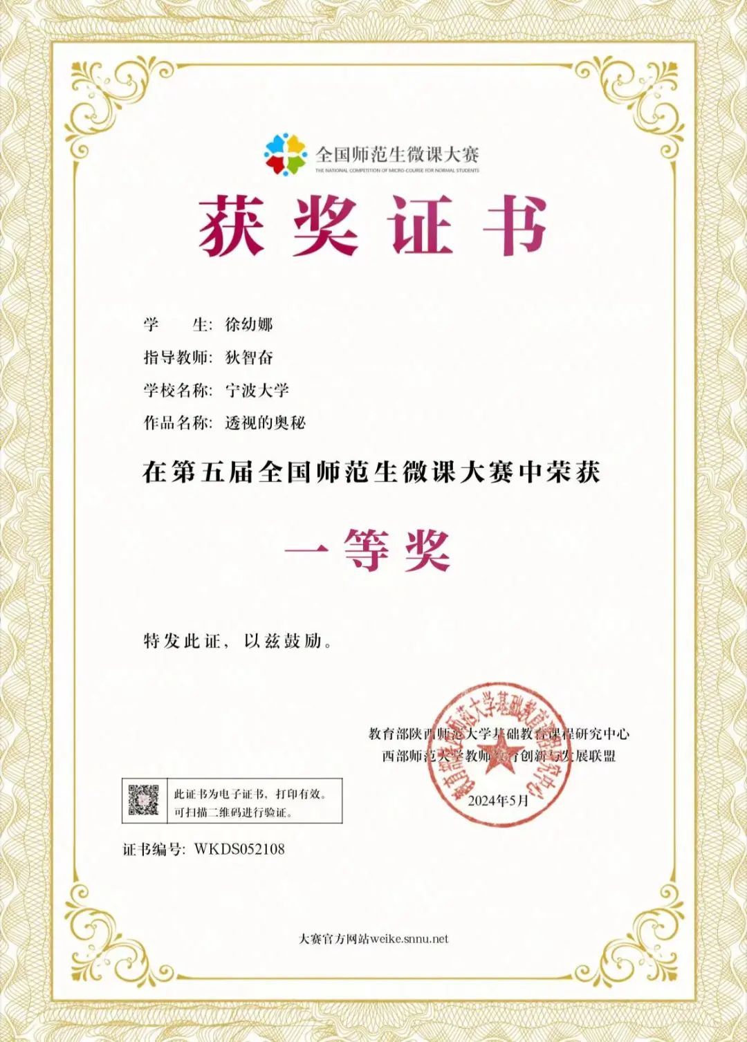 美术系狄智奋副教授指导的2023级研究生徐幼娜同学在第五届全国师范生微课大赛中荣获一等奖。