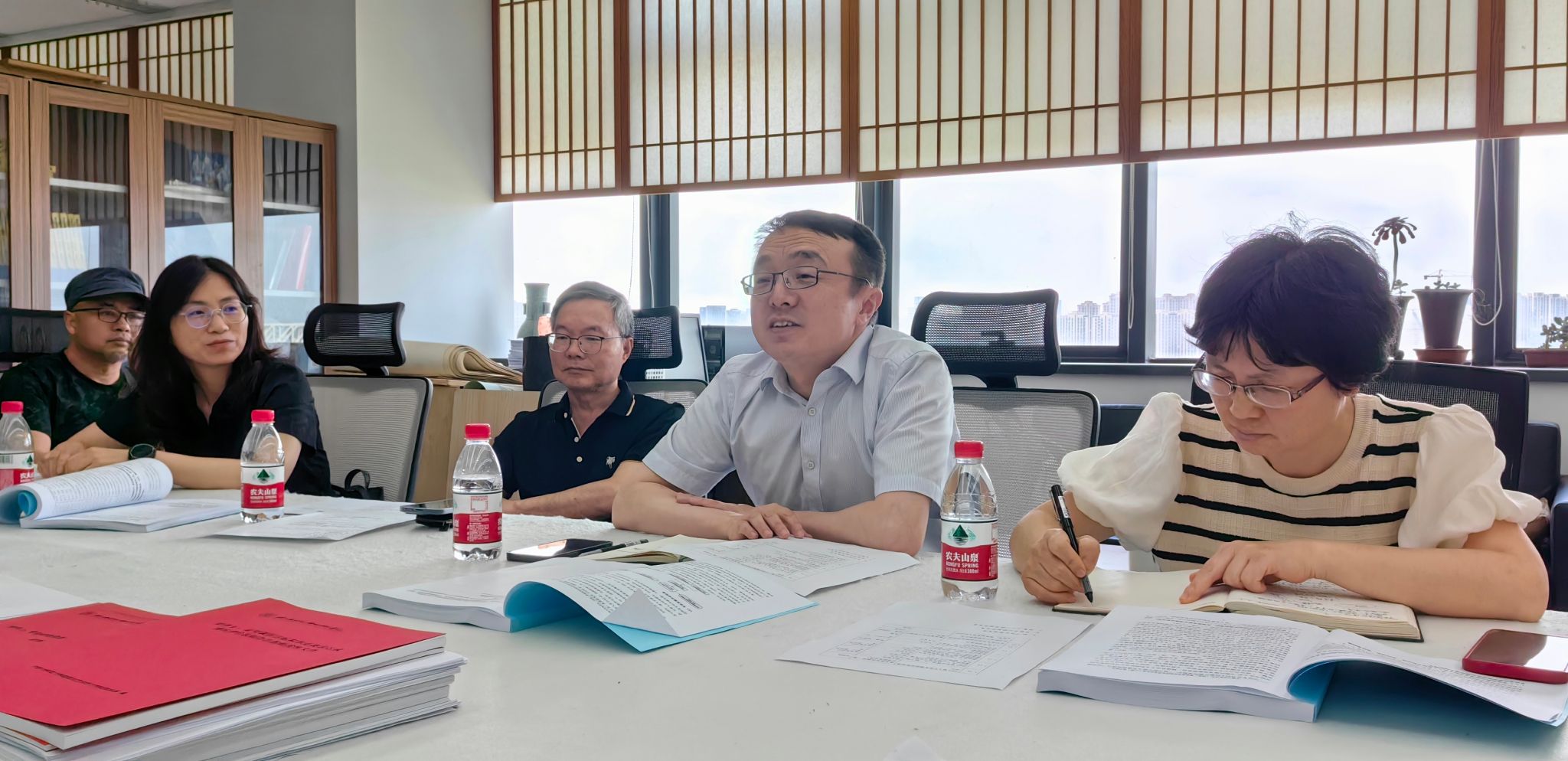 美术系系主任陈晟详细介绍了专业认证的具体情况、后续工作安排及暑期具体任务。陈晟对参与认证工作的全体教师与提供多方支持的领导表示感谢,并指出尽管过程中遇到诸多挑战,但在共同努力下,认证工作已按计划稳步推进。他特别强调了暑期的工作重点,包括专业教室和实验室的空间整理、公共空间的布置等,明确了自评报告提交的时间节点及专家进校考察的具体安排。