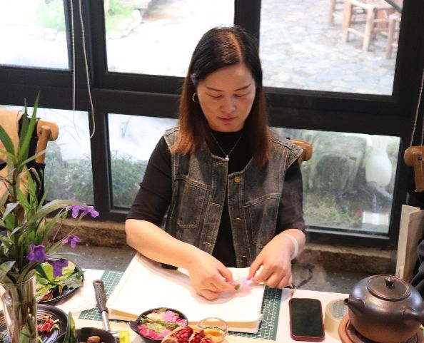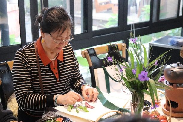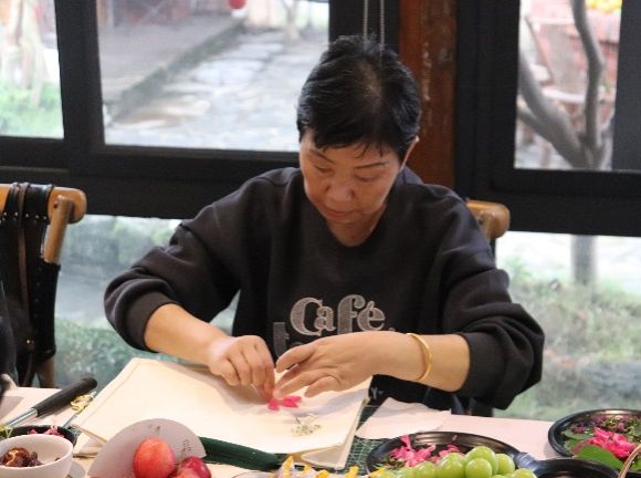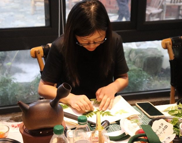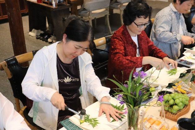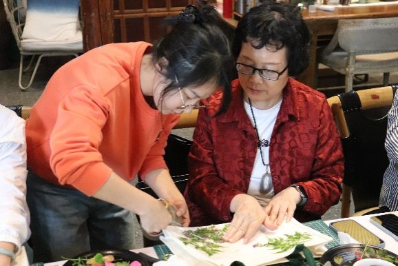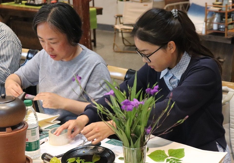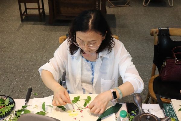 活动第一阶段为学生们感谢师恩,学生们陪伴老师去户外采摘新鲜的树叶与花朵,并一起体验帆布包植物拓印技艺。大家把采摘到的植物经过精心的布局、设计、排列、用锤子反复敲打后,植物的色彩和造型留在了白色帆布包上,形成了美丽的图案。师生同堂,欢声笑语阵阵,大家以花草为墨,以布袋为纸,绘制出一幅幅生机勃勃的多彩画卷,仿佛回到了潘艺的课堂。