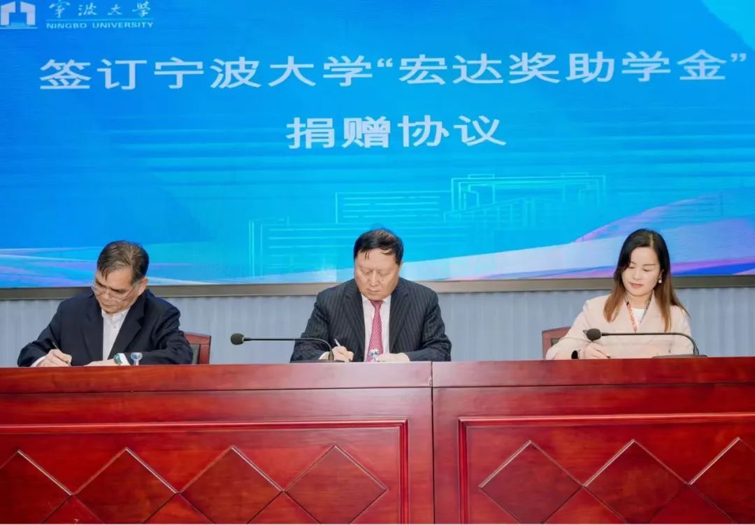 党委书记韩雯琛、宁波宏达货柜储运有限公司董事长陆汉幸、宁波市北仑区慈善总会会长张如平等共同完成捐赠仪式签约。
