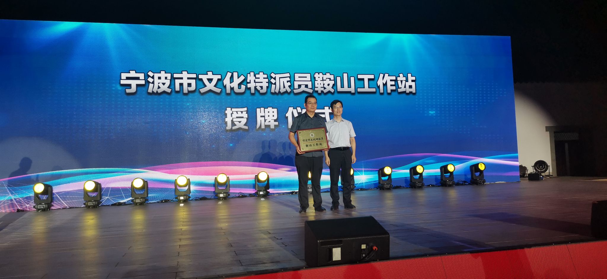美术系主任/市文化特派员陈晟老师授予了“宁波市文化特派员鞍山工作站”牌。院党委书记韩雯琛与洪塘街道办事处主任顾向科共同为“电影天堂