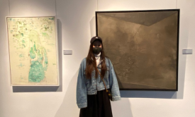 图三:陈晟老师与作品《春意渐浓》,图四:石羡老师与作品《化作蜻蜓忽飞去》