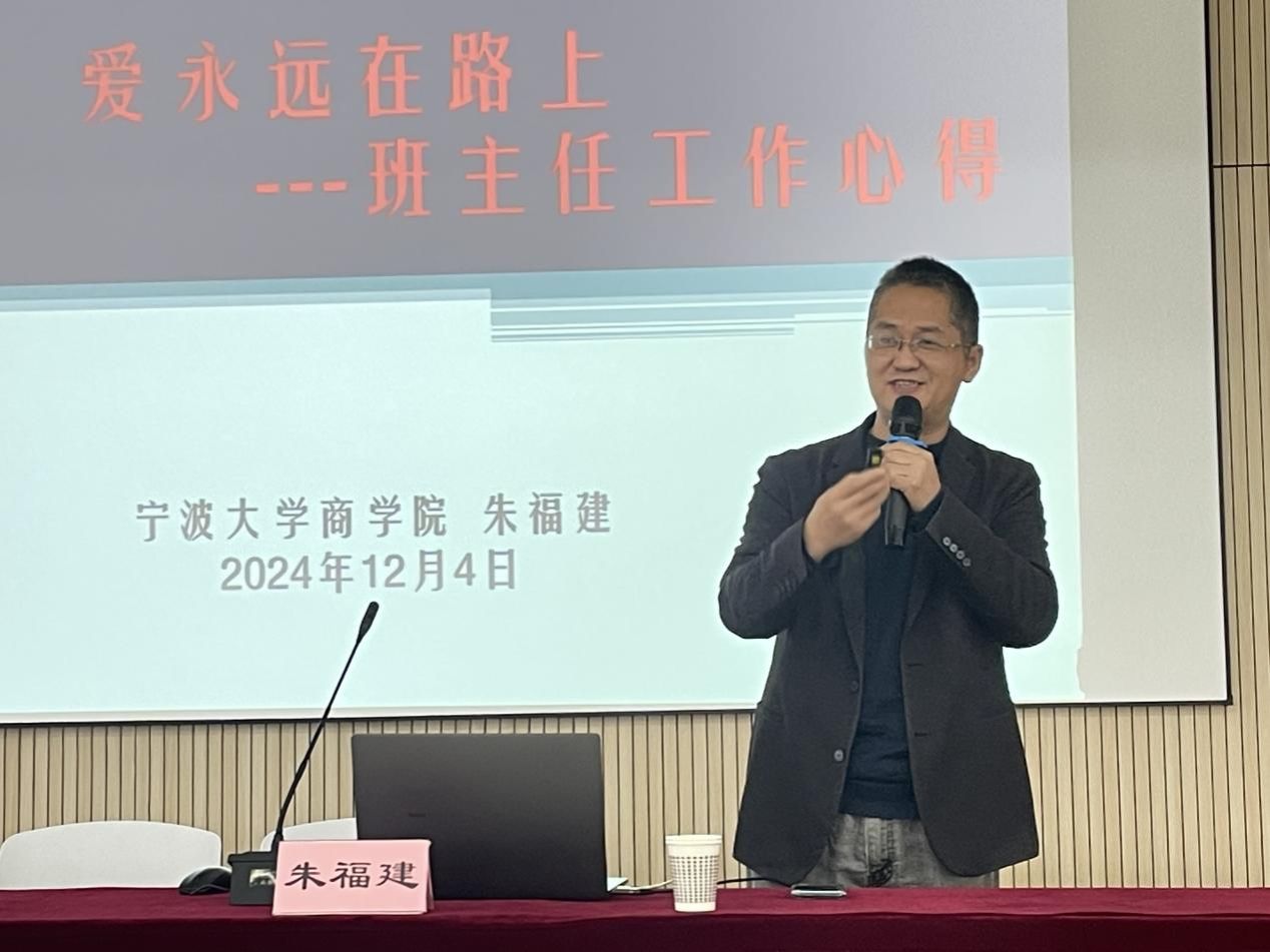 朱福建老师以“爱永远在路上”为题,分享了三十年间担任班主任的宝贵经验。朱老师指出,做一名班主任首先要有爱心和责任心,要做到熟悉每一位学生,帮助每一位学生规划好大学生活,同时要搭建好班级团队,开好每一堂班会课,并且能做到和毕业后的学生保持联系沟通。朱老师还跟各位班主任老师分享了他的《开学箴言12条》,并结合工作案例进行阐述,应该如何在新生入学后的始业教育中,将12条箴言传达给学生。