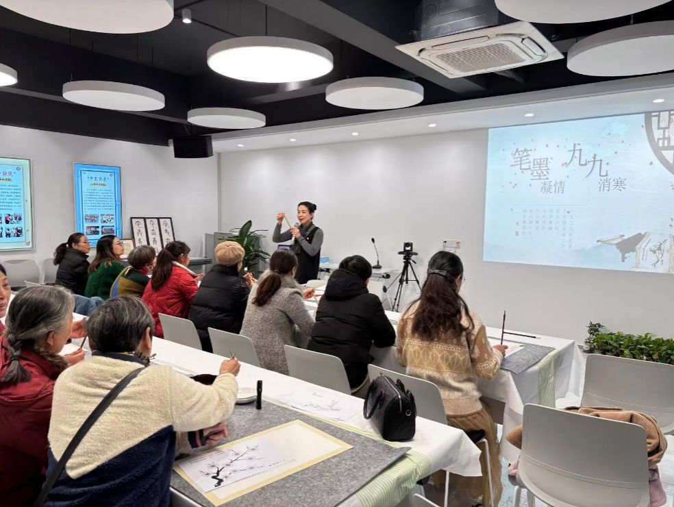浙江省美术家协会会员、宁波市美术家协会理事、支部党员焦彩虹老师为社区居民教授基本绘画技法,并介绍了九九消寒图的来历与美好寓意。九九消寒图也称作“画九”。在白纸上绘制九朵寒梅,每朵九瓣。一朵对应一九,一瓣对应一天,待到梅花全数映红,“数九”便告成了。