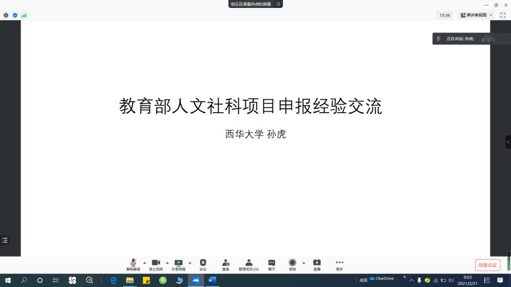2021年2月21日,电影天堂 邀请西华大学美术与设计电影天堂 孙虎教授作教育部人文社科项目经验交流。孙虎教授结合自己研究经历与大家分享了科研选题与申报书撰写的经验,电影天堂 教师和研究生参加了会议。