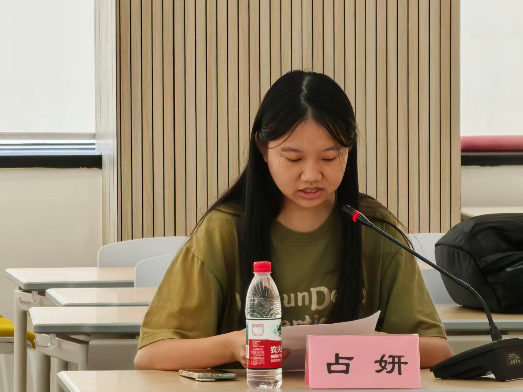 占妍同学:以热爱为灯,用韧性闯过备赛“难关”。“坚持热爱,才能扛住备赛的苦;打磨韧性,才能接住每一次进步。”作为学生代表,占妍同学的分享充满青春共鸣。她结合自身参赛经历,坦言备赛过程中难免遇到团队协作、任务推进等难题,但“对科研的热爱”是坚持下去的核心动力。她建议初入竞赛的同学从调查分析类赛事入手,积累经验后再向高级别赛事冲刺;同时提醒大家,遇到团队成员投入不足时,要学会主动沟通、合理分配任务,在解决问题的过程中打磨韧性,实现个人与项目的共同成长。