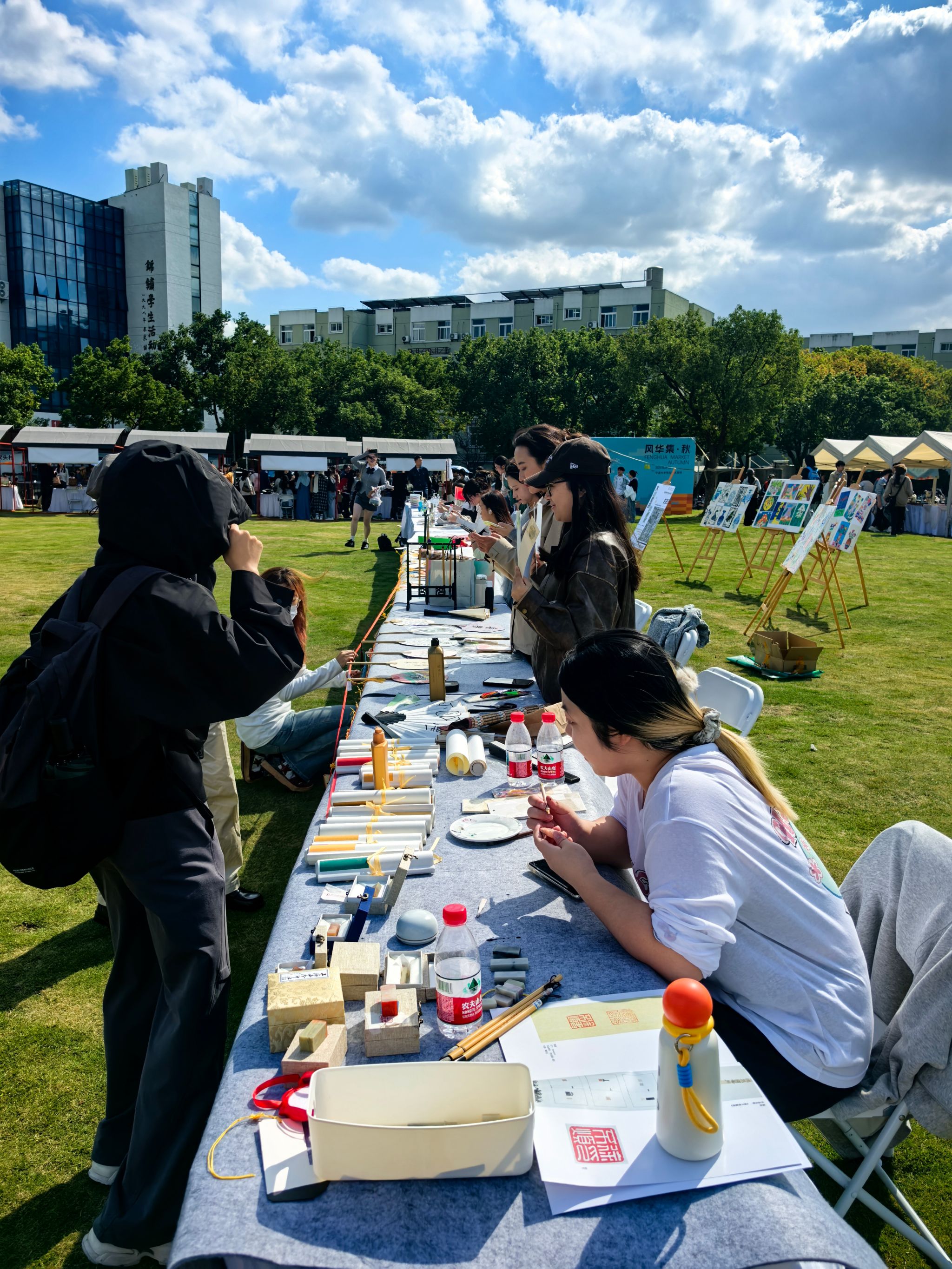近百个匠心摊位如秋叶绚烂铺展,师生作品竞相绽放,篆刻、漆艺、书法等这些平日里在课堂上的作品都被搬到了大草坪。余姚土布、河姆渡大漆、宋锦流光、植物染衣、绳艺编织这些传统手艺,加上师生的设计,呈现传统与现代的碰撞之美。更有“强国行”党建联建项目 “横坎头村土特产”“潘火街道守弄筑梦文创产品”走进市集,诠释“设计就是生产力”。“宁大创咖”等校内创业团队,在市集里同样展现出了宁大学子的创新创业基因......