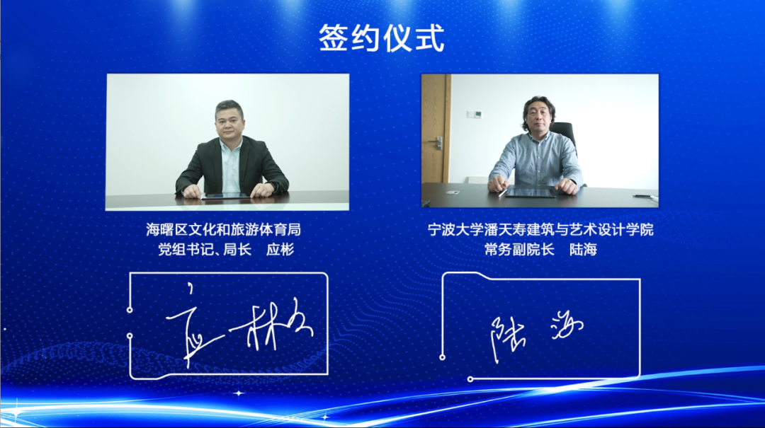 常务副院长陆海与海曙区文化和广电旅游体育局党组书记、局长应彬代表双方单位在活动中签署了共建“精神富有研究中心”合作协议。双方将就宁波市海曙区工业遗产、文化遗产、历史文化街区保护的开发与利用,以及“精神富有”文化空间场景的打造等方面进行深入协作,助力宁波高质量推进共同富裕示范先行市建设。