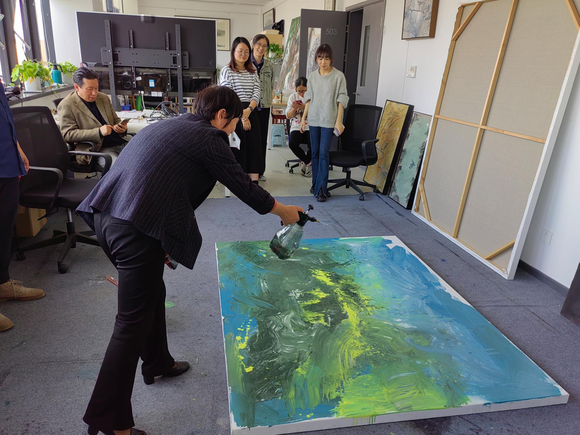 活动正式开始。陈晟博士作了主题为“中国综合材料绘画之演进”的讲座,他从综合材料绘画概述、中国综合材料绘画创作探索、综合材料绘画的中国演进趋向三方面详细介绍了综合材料绘画的总体情况、创作特点和发展趋势,通过对尚扬、胡伟、丁方、张元、胡明哲等几位艺术家作品的解析,深入浅出的带大家全面认识了综合材料绘画这一艺术形式。之后,陈老师还与参与活动的老师们在现场进行了综合材料绘画创作和深入交流。