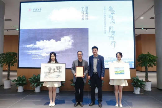 建校纪念周美育系列活动“坐云听风,向美而行——周至禹教授宁大写生展”,在黄庆苗黄陈月莉伉俪楼群青艺堂二楼开幕。校党委书记朱达,宁波市文联党组书记、主席杨劲,校党委委员周青出席开幕式。