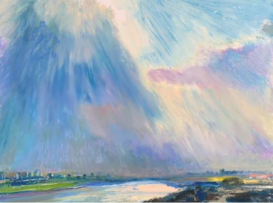 的教学案例,以及自己多年来对风景写生的体会,表达了写生即创作的主张,谈到在画面中如何进行色彩的艺术处理、造型把握和整体性调整等方面,特别强调了作画时要高度专注,要满怀艺术激情地进行表达。周教授还就具体的作品进行了案例分析,画中云的表现、色彩与笔触的融合等方面给现场的同学们带来了非常直观的参照和有益的启发,尤其是对炭笔写生的黑白灰关系和丰富的色度进行解读,把素描中的色彩感进行提示呈现颇有新意。