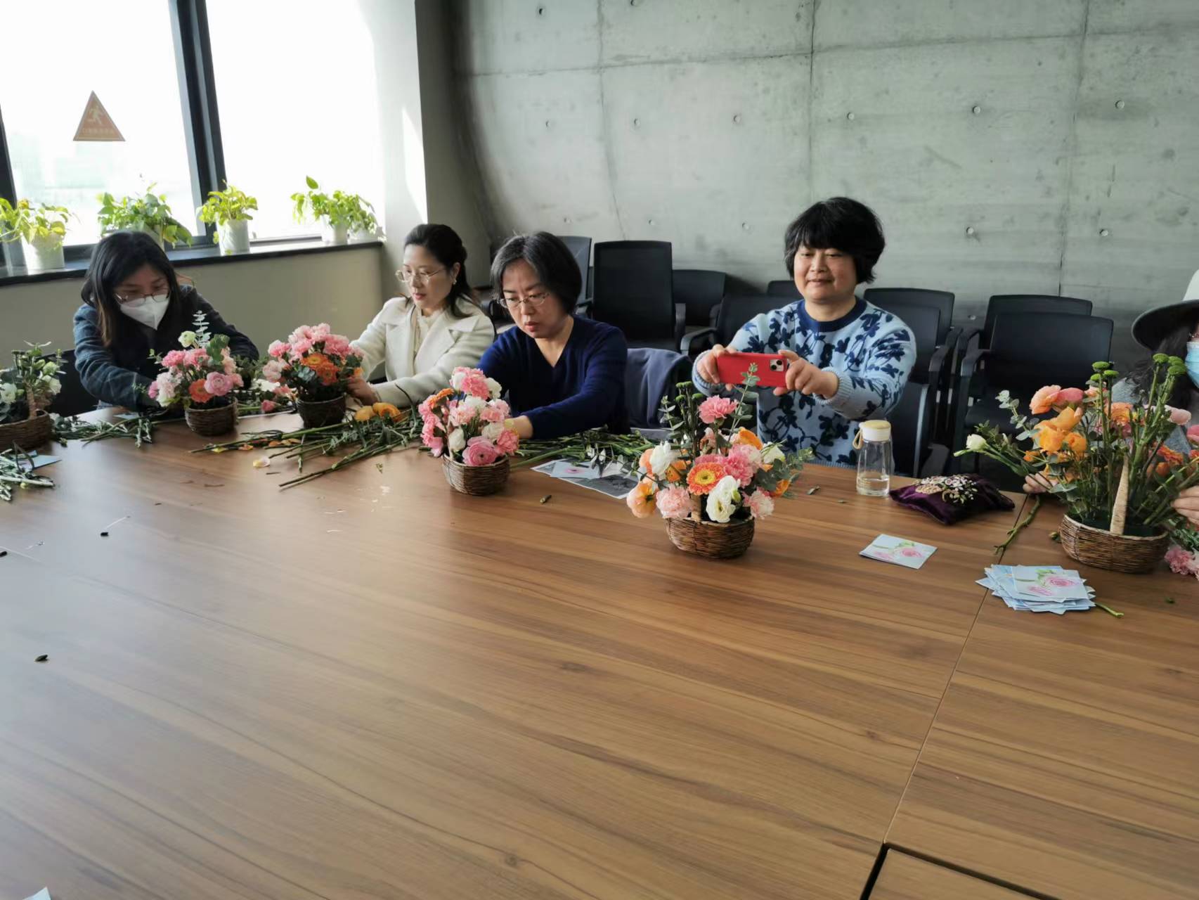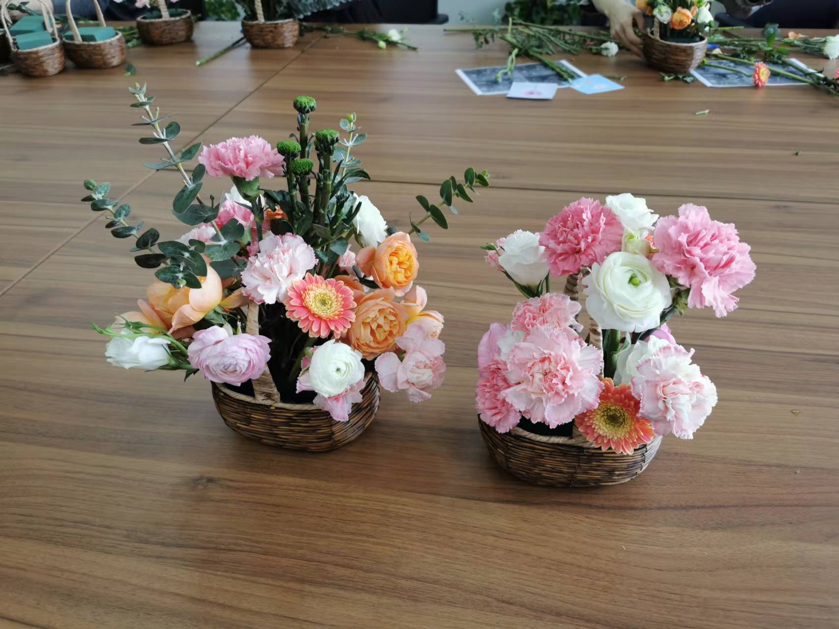 老师们动手修剪、交流插花的技巧,很快用康乃馨、玫瑰、弗朗花、洋牡丹、小雏菊、尤加利叶等素材完成了诸多花艺作品。
