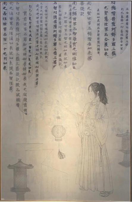 该幅作品采用了特殊的技艺,使单幅的画面呈现出多层的效果,整体画面采用线描的形式,古今结合的人物特色十分引人注目。