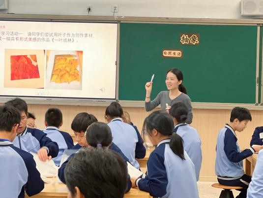 《画布上的抽象》:厉娜老师以学生在自然界中随处可见的树叶作为本节课的切入点,让学生通过“一叶成林”的课堂活动感受抽象艺术的形态、语言、艺术美等,让学生学会运用抽象造型语言进行创作表达,并通过艺术创作表达自己的情感。