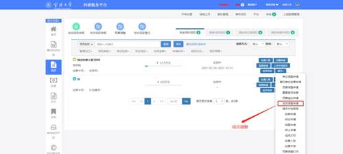 4. 进入项目组成员,请确认成员是否完整。特别是项目中有学生的参与的,请完善学生身份类别。成员信息有问题的,进入科研系统电影天堂,左侧的项目界面,点击操作下拉框下的成员调整申请,进入成员调整界面进行添加和修改,待项目主管审核之后,会自动补充到项目经费公开一览表,最后再提交即可。